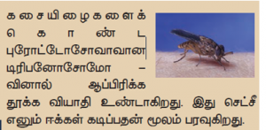 விளக்கம்: கசை இழைகளைக் கொண்ட புரோட்டோசோவாவான டிரிபனோசோமோ – வினால் ஆப்பிரிக்க தூக்க வியாதி உண்டாகிறது.