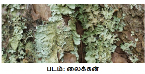 விளக்கம்: லைக்கன்கள் கால நிலை மாற்றத்தினையும் காற்று மாசுபடுதலின் விளைவுகளையும் விளக்கும் ஒரு உயிரி – சுட்டியாகும். லைக்கன் என்பது பாசி மற்றும் பூஞ்சை உயிரிகளின் ஒருங்கிணைந்த ஒர் அமைப்பாகும். வெப்பநிலை, ஈரப்பதம், காற்று மற்றும் காற்று மாசுபடுத்திகள் போன்ற உணர் திறனுடைய சுற்றுச் சுழல் அளவி லைக்கன்கள் ஆகும். இது காலநிலை, காற்றின் தரம் மற்றும் உயிரியல் செயல்முறைகளின் மாற்றங்கள் பற்றிய தகவல்களை அளிக்கிறது