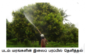 விளக்கம்: இலையில் தெளிப்பு எனப்படுவது திரவ நிலை உரங்களை இலைகளில் நேரடியாக செலுத்தி தாவரங்களுக்கு ஊட்டமளிக்கும் நுட்பம் ஆகும். இலையின் ஊட்டப்பொருள் உள்ளெடுப்பின் திறன் மண்ணில் அளிக்கப்பட்ட ஊட்டப் பொருள்களை ஒப்பிடும்பொழுது பல மடங்குகள் அதிகம் இருப்பதாக கருதப்படுகிறது. வேரினால் ஊட்டப்பொருள் உறிஞ்சுதல் சூழ்நிலை காரணிகளால் தடுக்கப்படும்பொழுது இலை வழி ஊட்டமளித்தல் பரிந்துரைக்கப்படுகிறது.